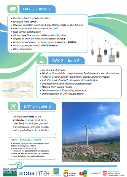 Ljetna škola predstavlja prvi dio programa (Tehnički aspekti) dok će se drugi dio, usmjeren na ekološke aspekte offshore vjetroparkova, održati u Nacionalnom institutu za oceanografiju i primijenjenu geofiziku (OGS) u Trstu: