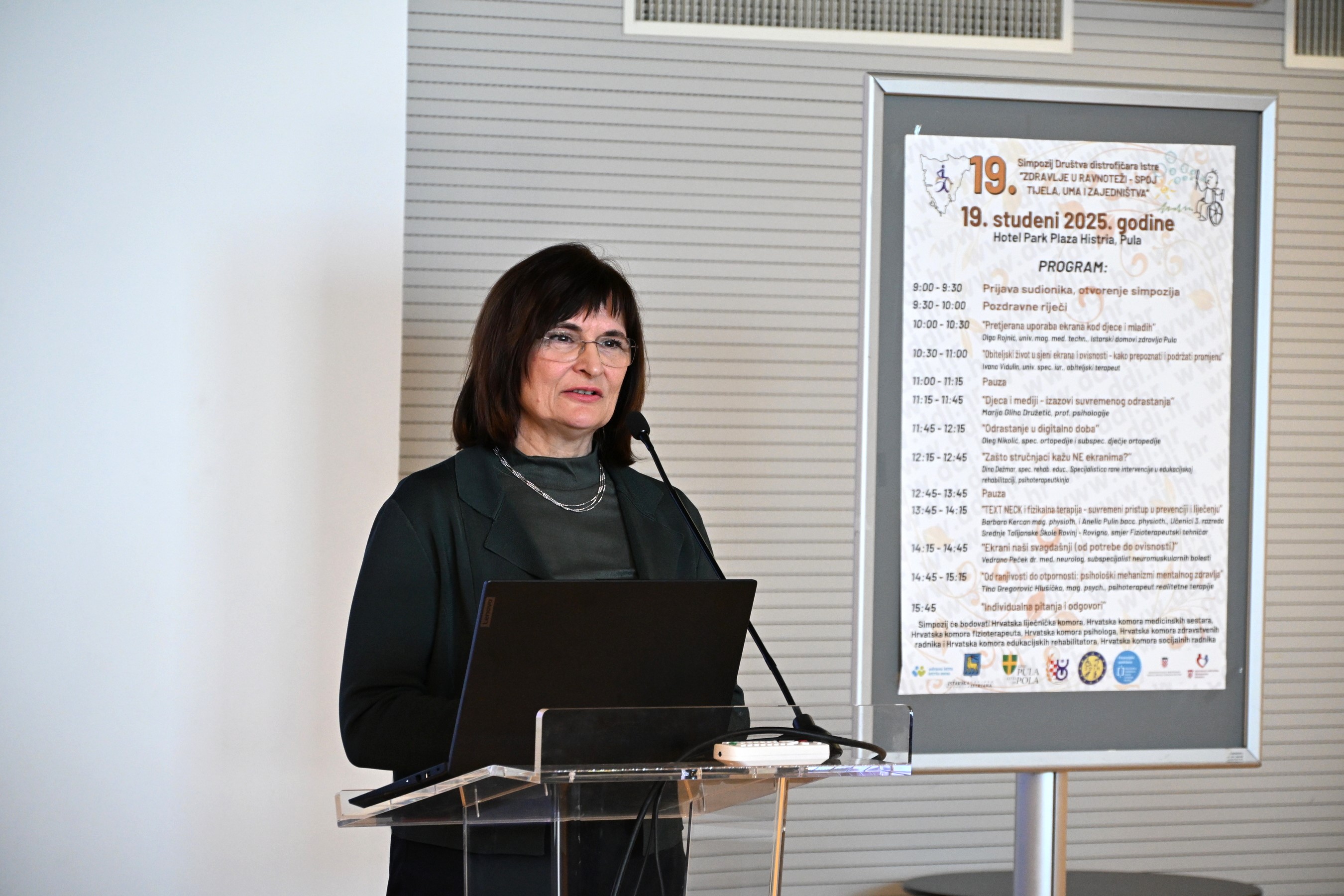 Nakon svečanog otvorenja uslijedio je bogat stručni program u kojem su sudjelovali Olga Rojnić, Ivana Vidulin, Marija Gliha Družetić, Oleg Nikolić, Dina Dežmar, Barbara Kecman i Anelia Pulin s učenicima Srednje talijanske škole Rovinj, smjer Fizioterapeutski tehničar, zatim Vedrana Peček i Tina Gregorović Hlušička. Teme su obuhvatile utjecaj ekrana i digitalnih tehnologija na djecu i mlade, obiteljske odnose, mentalno i tjelesno zdravlje te razvoj ovisničkih obrazaca. Simpozij se nastavlja kroz stručna predavanja i razmjenu iskustava s ciljem unaprjeđenja kvalitete života osoba s neuromuskularnim bolestima i njihovih obitelji.