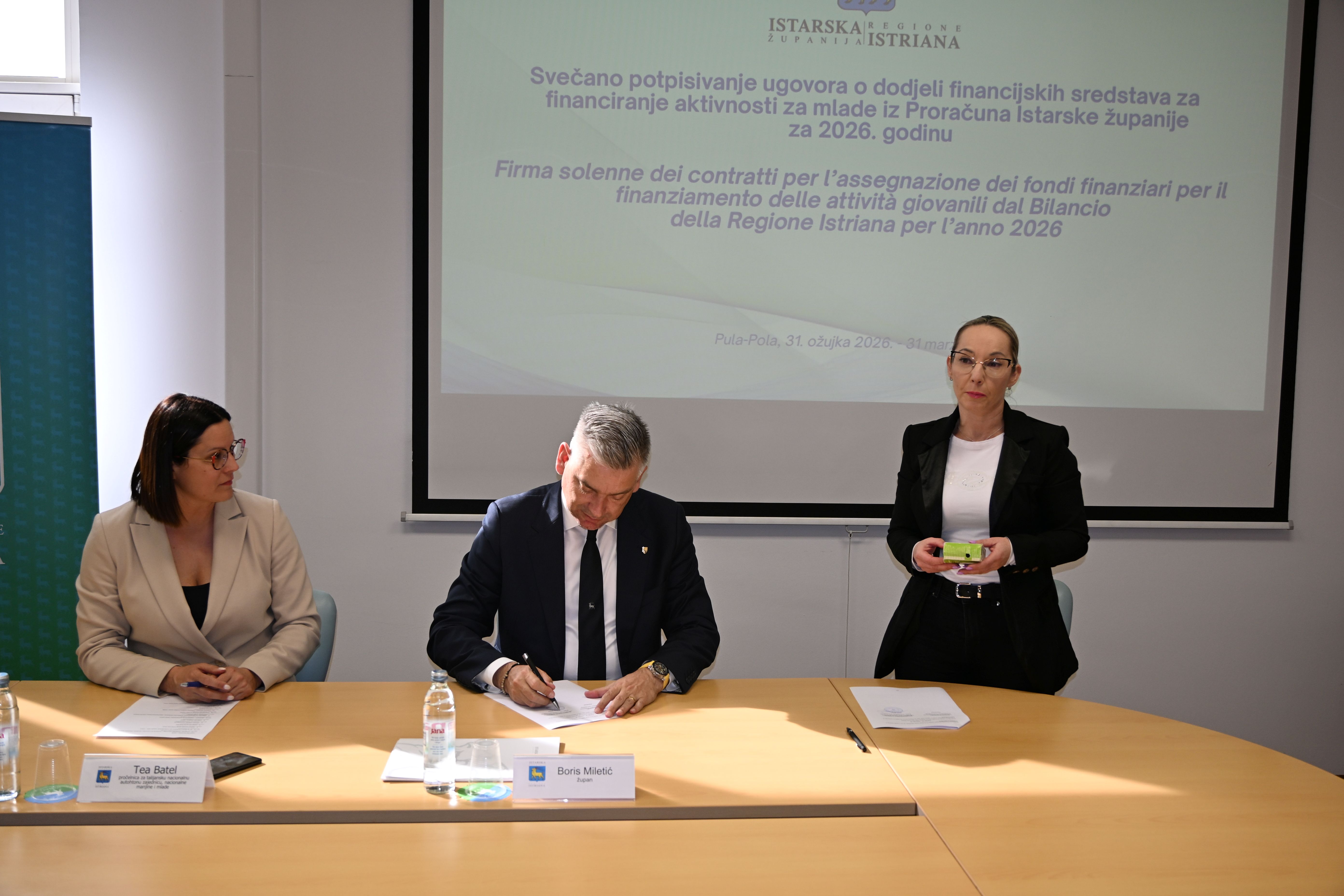 U prostorijama Istarske razvojne agencije, u Puli, istarski župan Boris Miletić potpisao je ovog tjedna ugovore o dodjeli financijskih sredstava za financiranje aktivnosti za mlade iz Proračuna Istarske županije za 2026. godinu s predstavnicima udruga i organizacija civilnog društva.
